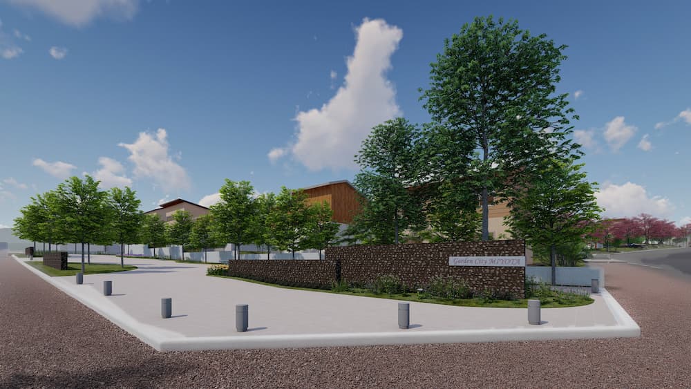 計算されて栽植される山桜と楓の並木道、エリア内電柱の埋設化、ラウンドアバウトと両脇の公園(無電柱無信号)。ゾーニングで分けられた居住エリア、次世代の複合公民館であるプラザ。